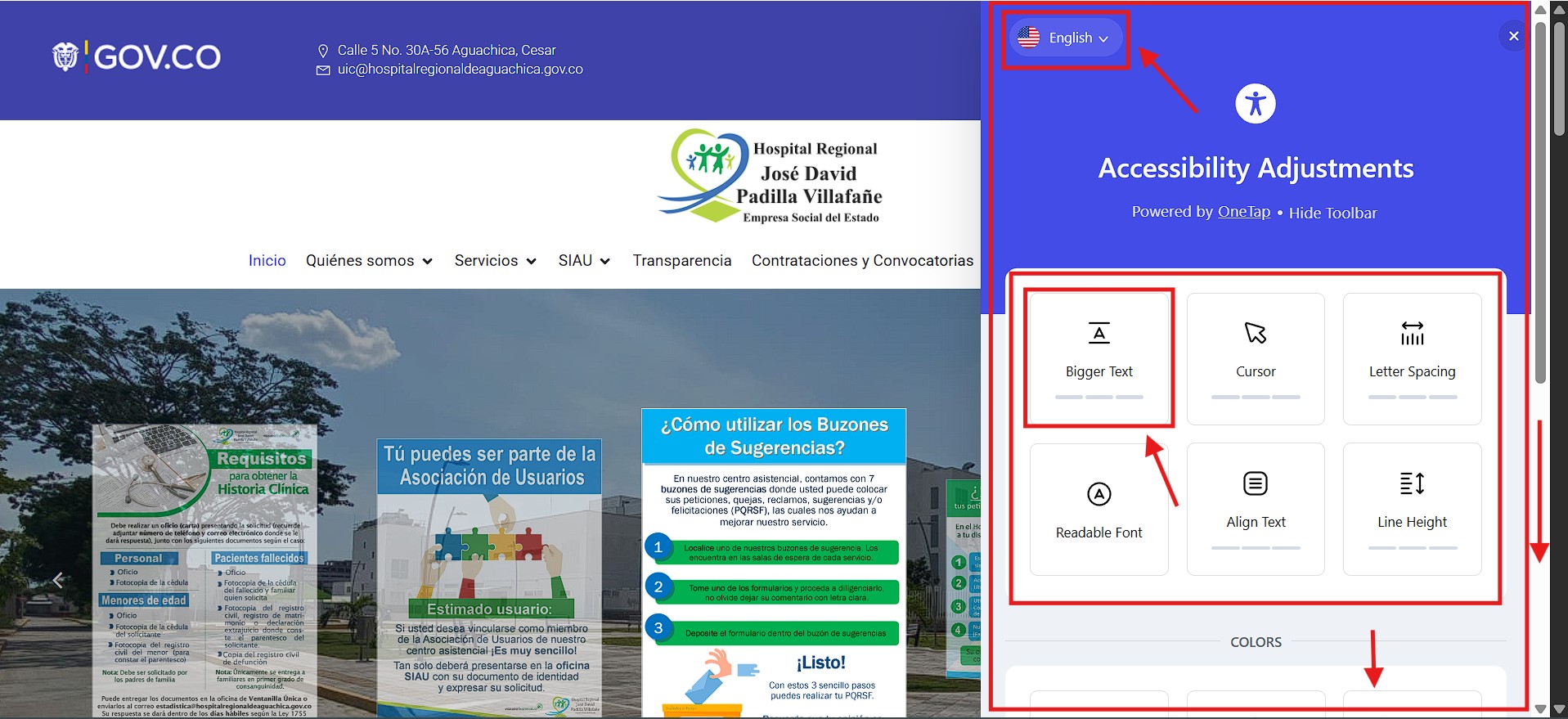 En la parte superior del panel se encuentra la opción para cambiar el idioma del sitio web (por ejemplo, al inglés). Además, la barra de herramientas ofrece diversas funciones de accesibilidad, como: