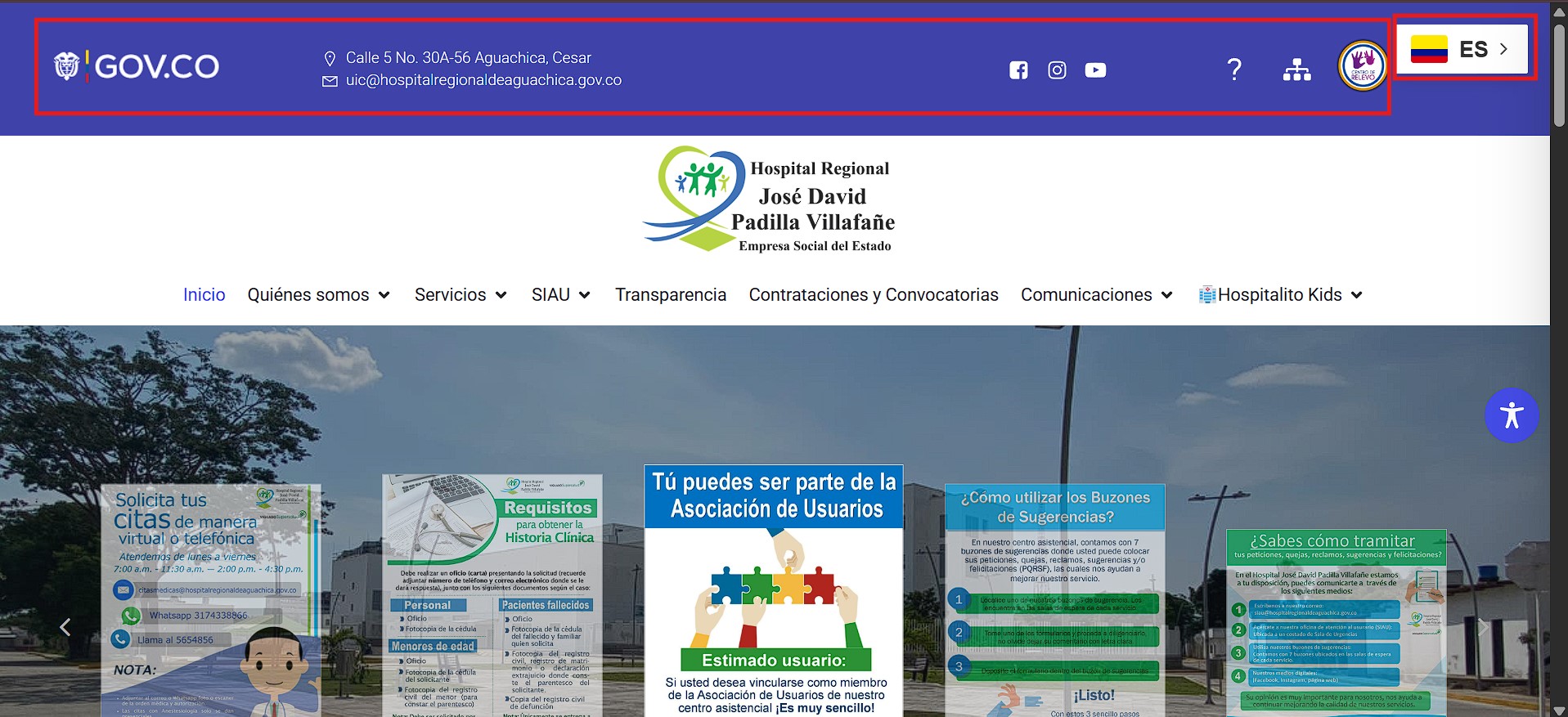 En la parte superior del sitio web del Hospital Regional José David Padilla Villafañe, E.S.E., se encuentra el encabezado institucional, donde podrá visualizar el logotipo de GOV.CO, la dirección física del hospital (Calle 5 No. 30A-56, Aguachica, Cesar) y el correo de contacto (gerencia@hospitalregionaldeaguachica.gov.co).