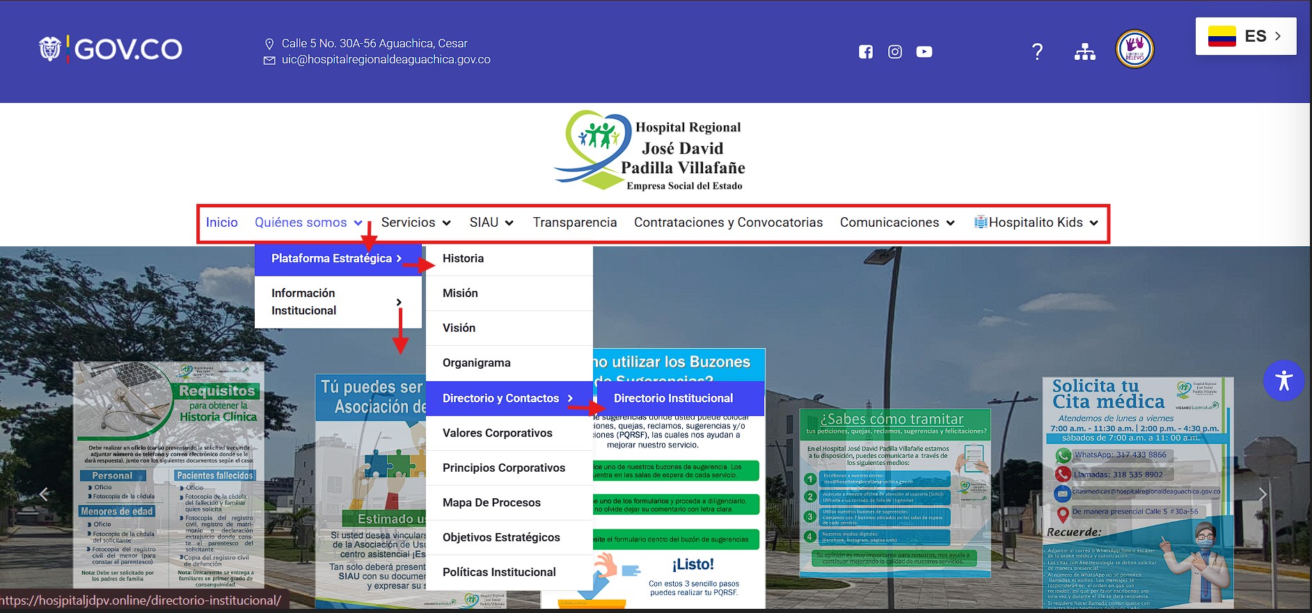A continuación, se presenta el menú principal del sitio web del Hospital Regional José David Padilla Villafañe, E.S.E., el cual le permitirá acceder de manera fácil y rápida a las diferentes secciones y servicios disponibles. En este espacio encontrará los distintos menús y submenús organizados para facilitar la navegación y el acceso a la información institucional, de atención al usuario y de transparencia.