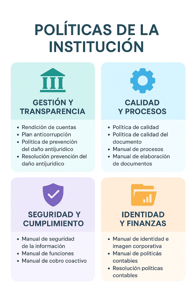 A través de lineamientos claros como la rendición de cuentas, los manuales de procesos y funciones, las políticas contables y de calidad, así como los planes de prevención del daño antijurídico, la institución asegura una gestión responsable, transparente y alineada con los principios de eficiencia, equidad y calidad.